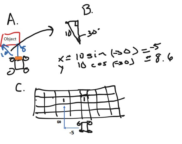 In part A, our sensor (the orange polygon) sends out signals (blue arrows). This signal hits the red box labeled “Object”. One signal hits at -30 degrees and one at 0 degrees. We get two distances back, 10cm and 8cm, respectively. To make this information useful to our car, we need to map these points onto a grid, shown in part C. This is your XY coordinate plane from Algebra.
